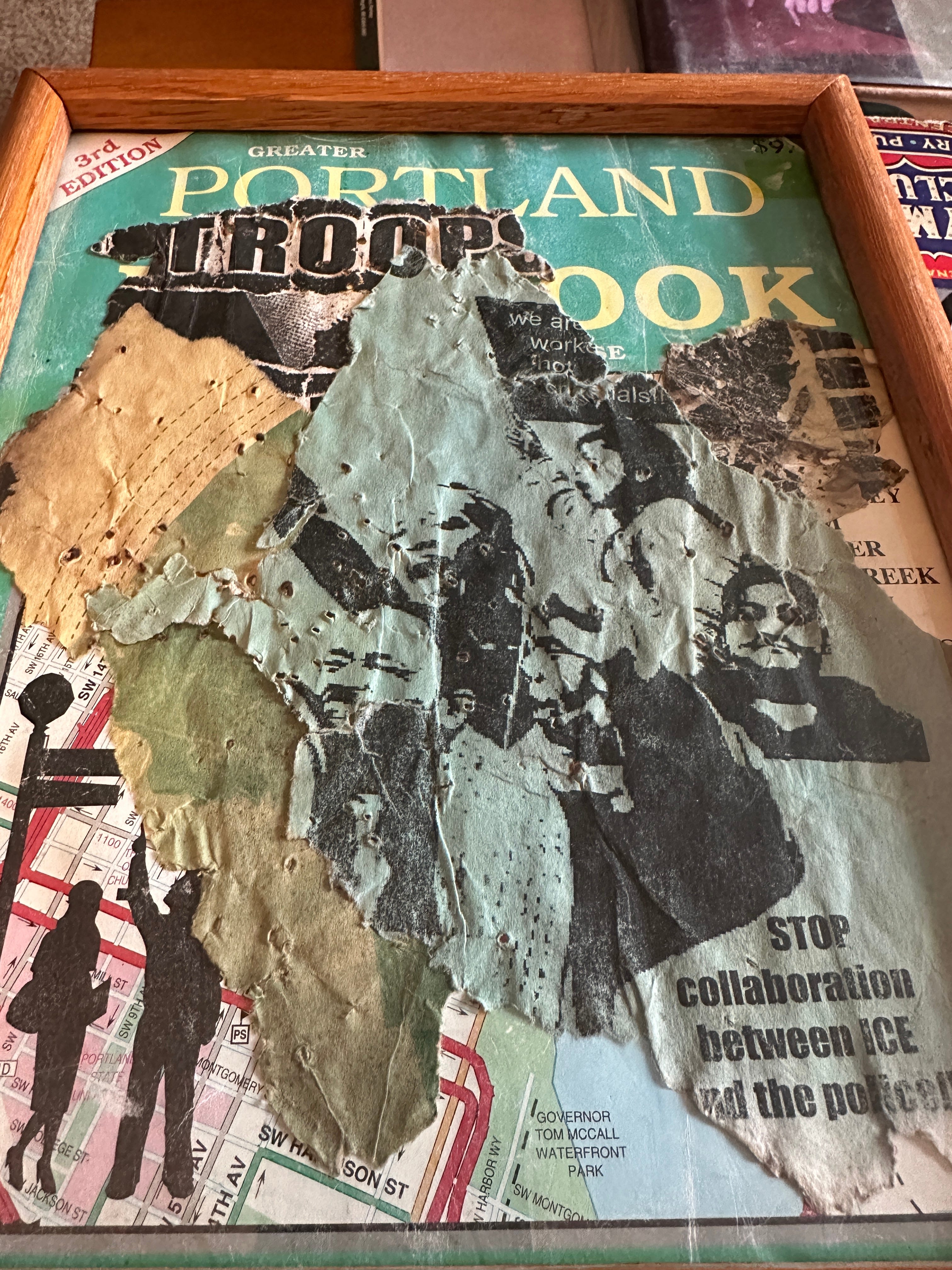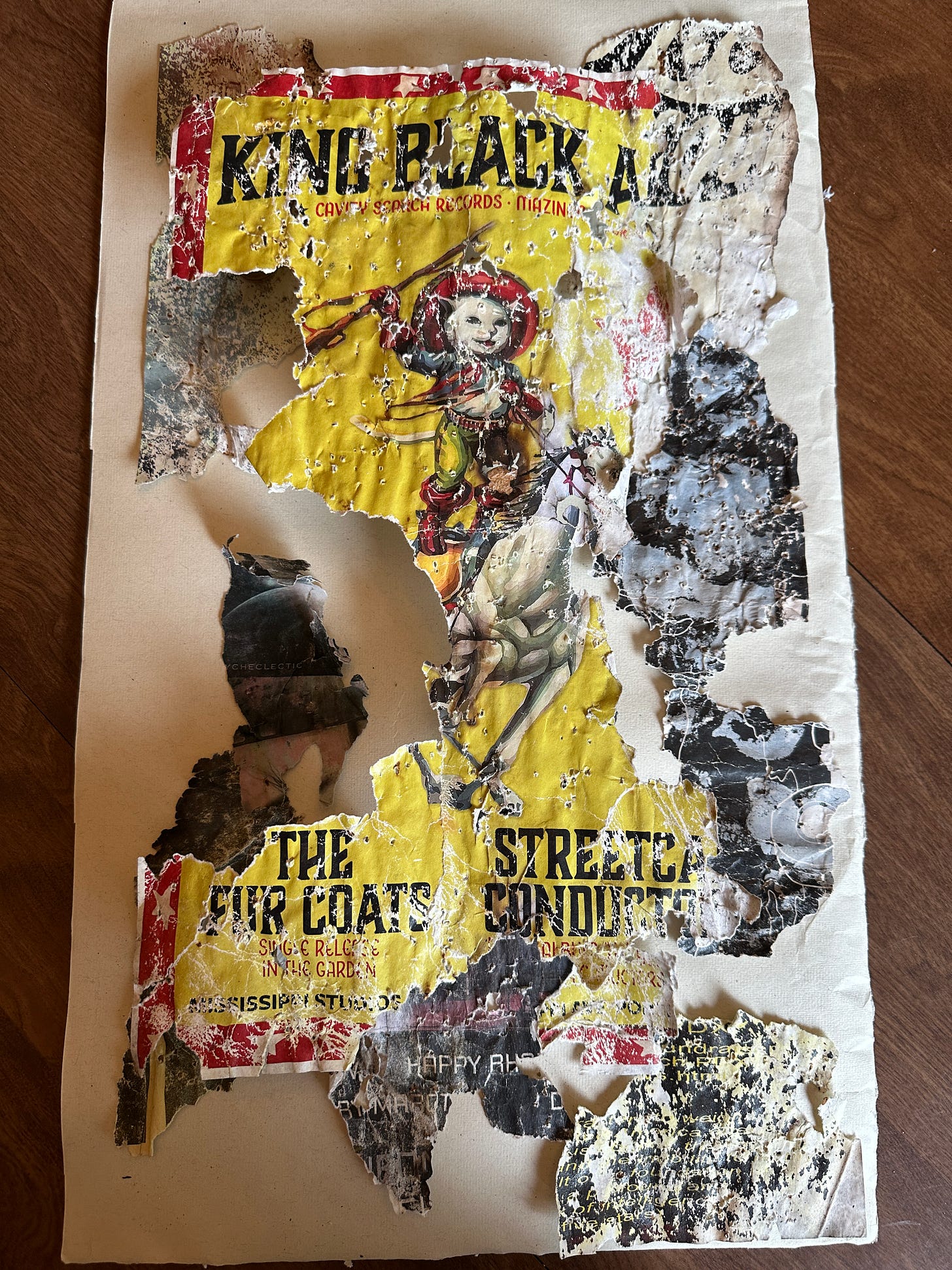 As I reckon with years of a fragment sensibility, I realize that instead of the “riddle buried in an enigma” concept, in my case it’s “a shard encased in a segment.” And for me it is all about the positive and the possible. It’s what enabled me at age 67 to turn to a new form of art, experimentally perhaps, using pieces of decades’ old, weathered rock-n-roll posters I peeled off power poles in Portland and placed in frames. Samples of what I call “Shard Visions” are shown at the top bottom of this post.
